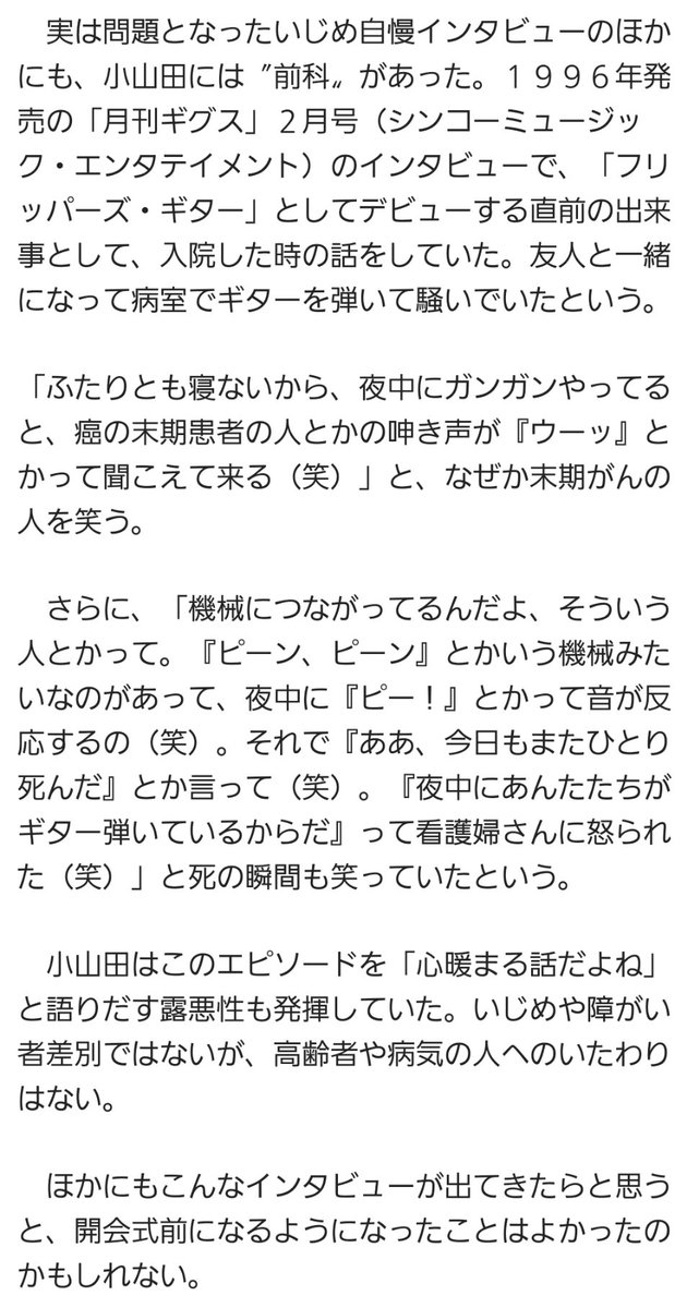 小山田圭吾の件、昔の話だから許されるってレベルじゃないと思うけど。もうやってること酷過ぎて、それを自慢話にしてる。 — いんと (@y_into) july 15, 2021.